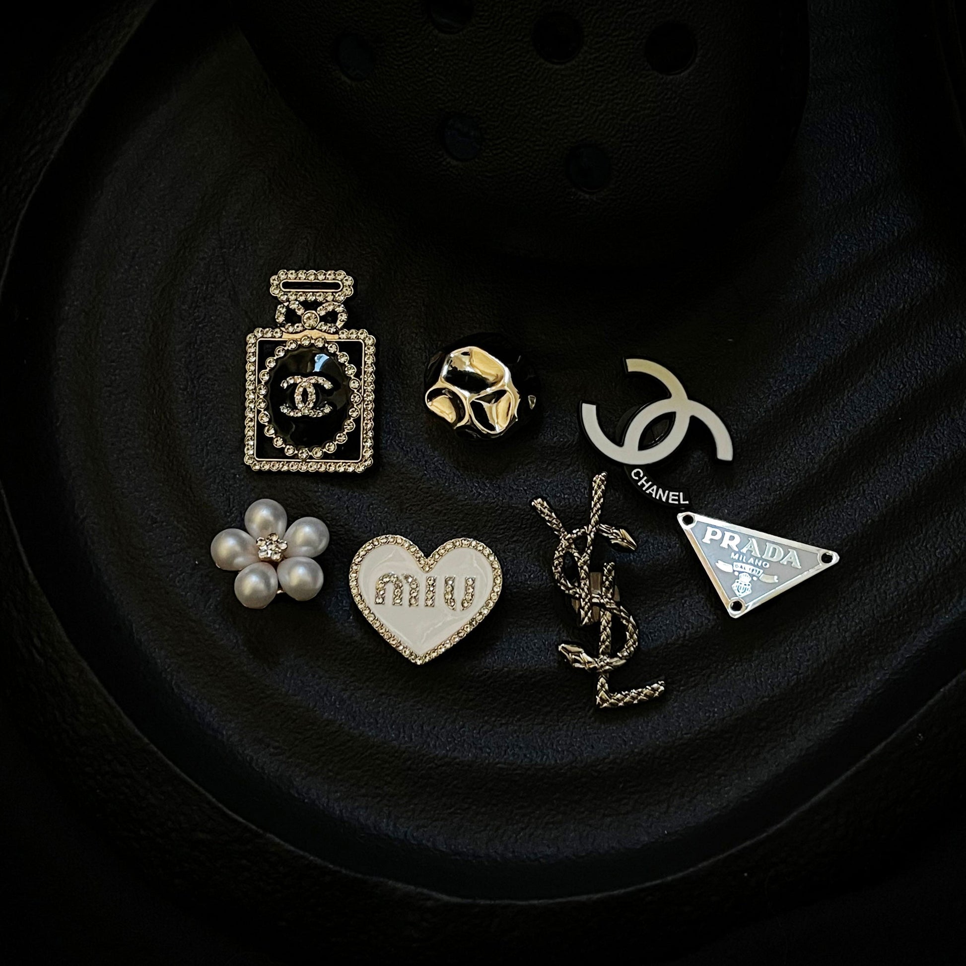 This black, white and silver-toned metal shoe flower is extremely cool! The shiny logo with crushed diamonds and pearls complement each other, presenting an extraordinary charm.