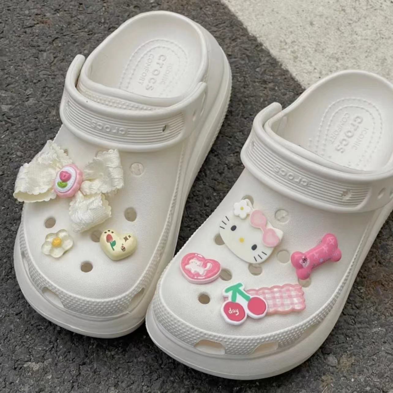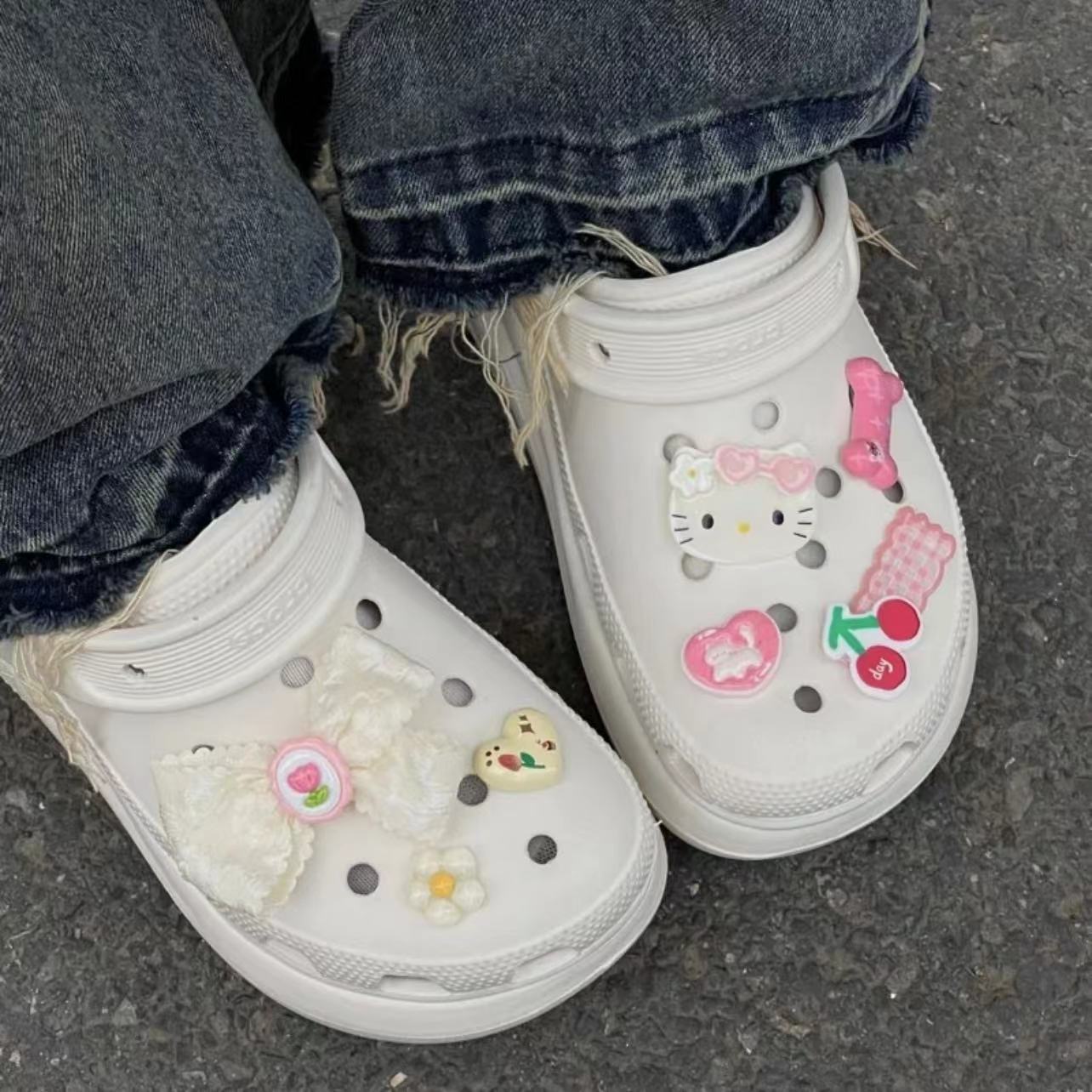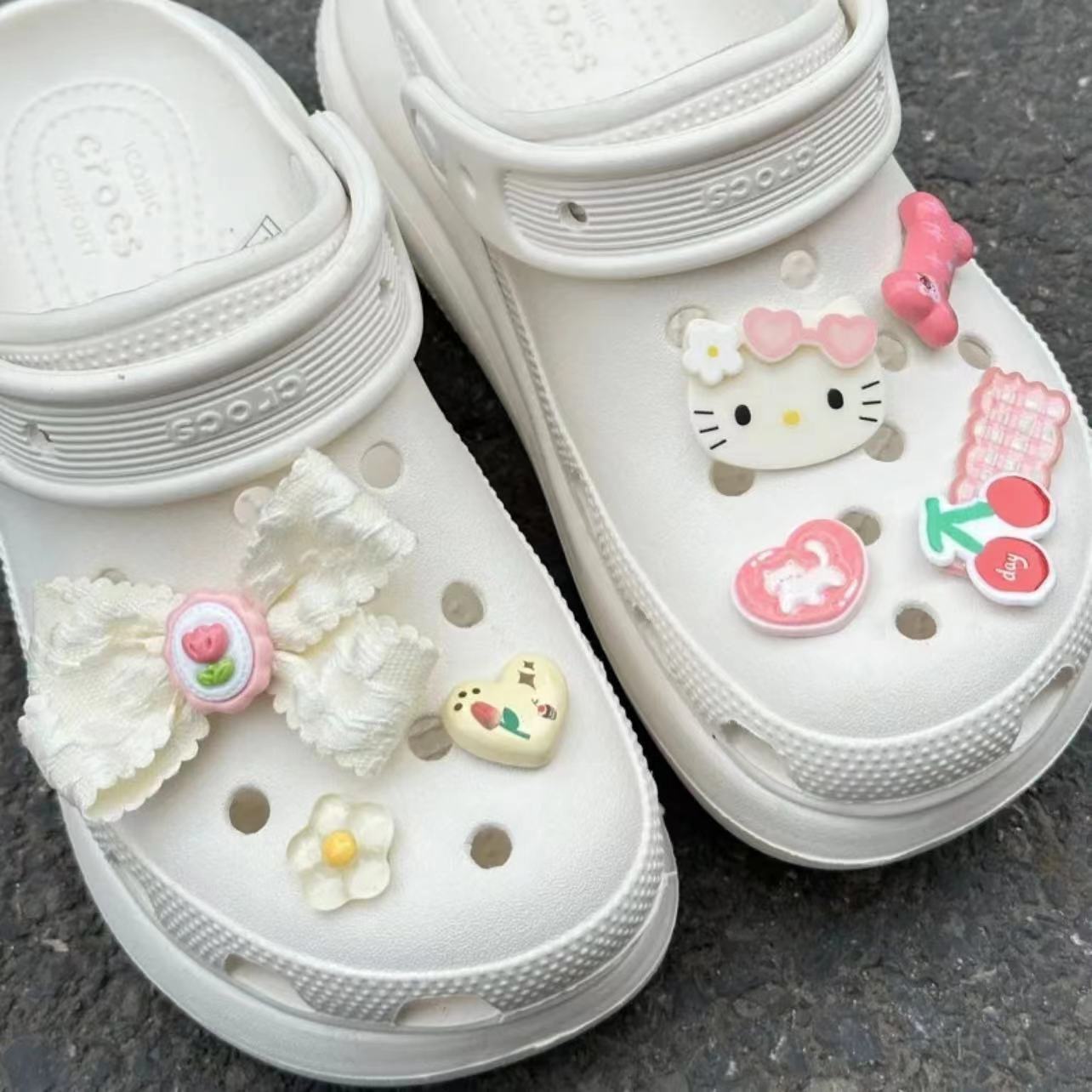 This hello kitty-themed cream glue shoe charm set is so charming! It includes hello kitty avatars, flowers, bows and cherry decorations. Each element is carefully designed, sweet and lovely, which can make your shoes full of girlish hearts and fairy tale