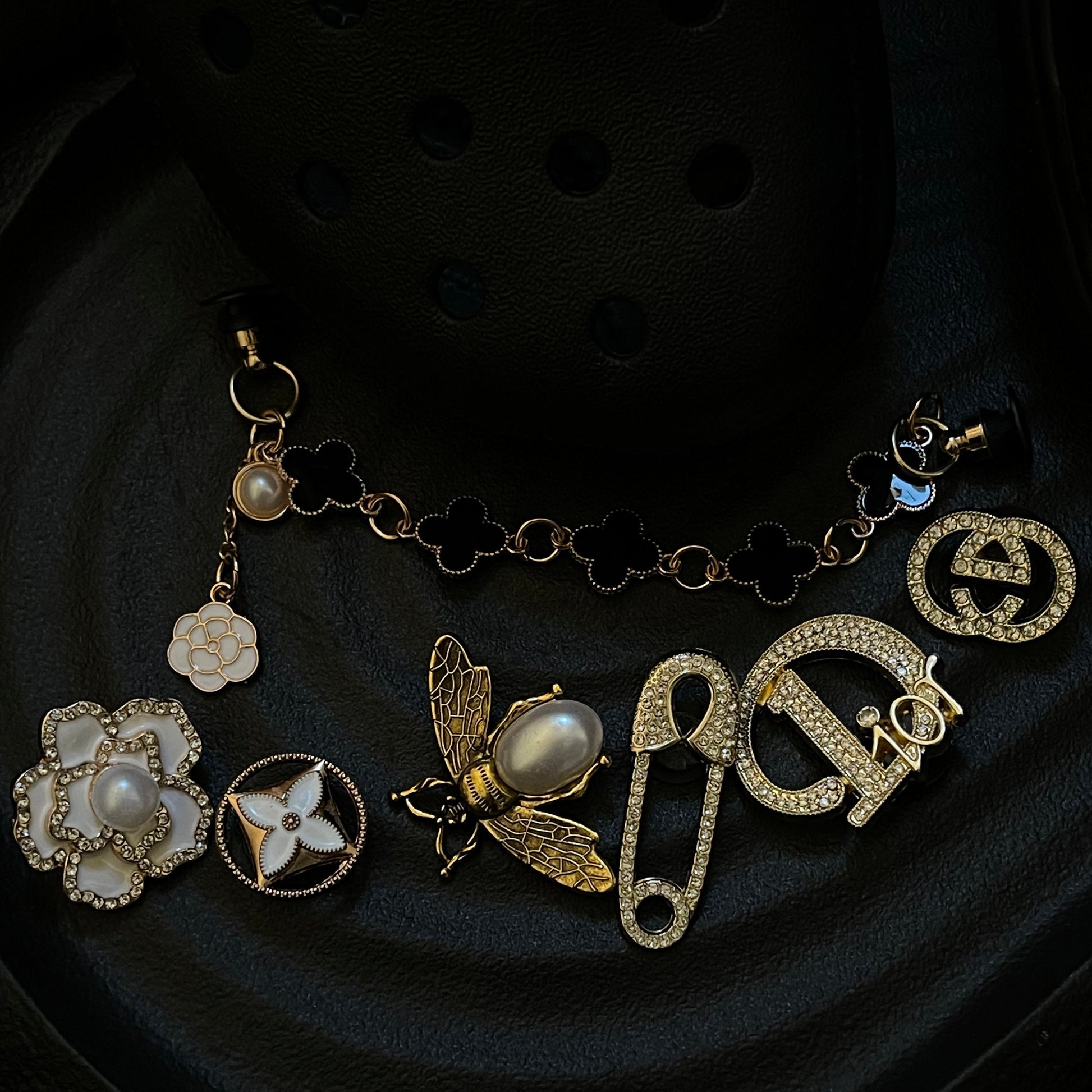 This group of shoe charms is full of shining elements. The golden logo and the exquisite rhinestones embellish them, making this set of shoe charms show extreme luxury.
